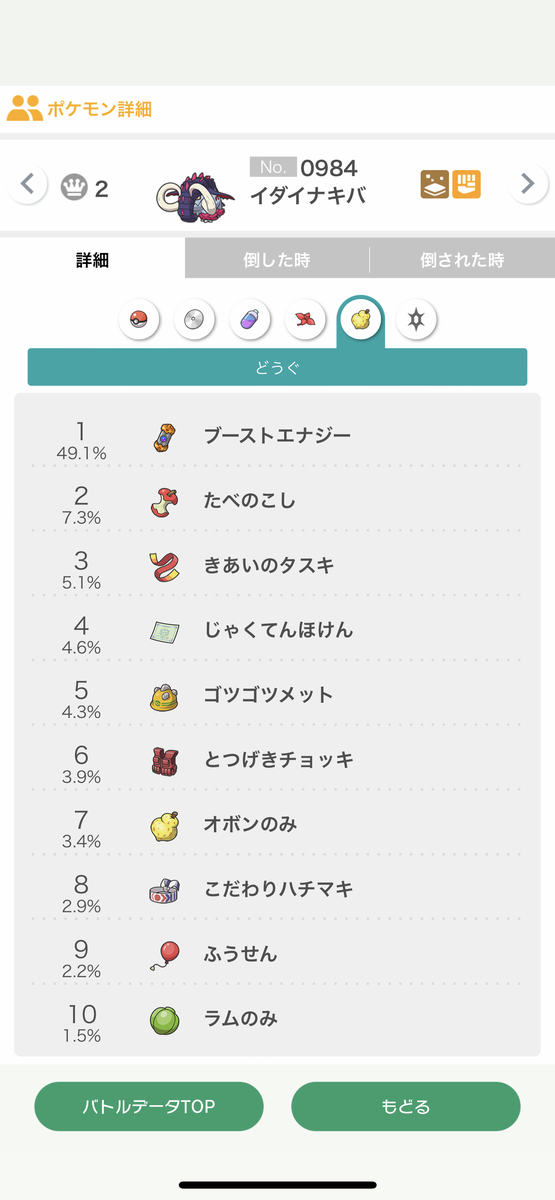 持ち物はたべのこしです。ブーストエナジーをはたきおとすことはできないので、はたきおとす採用が少なそうなのもポイントです。