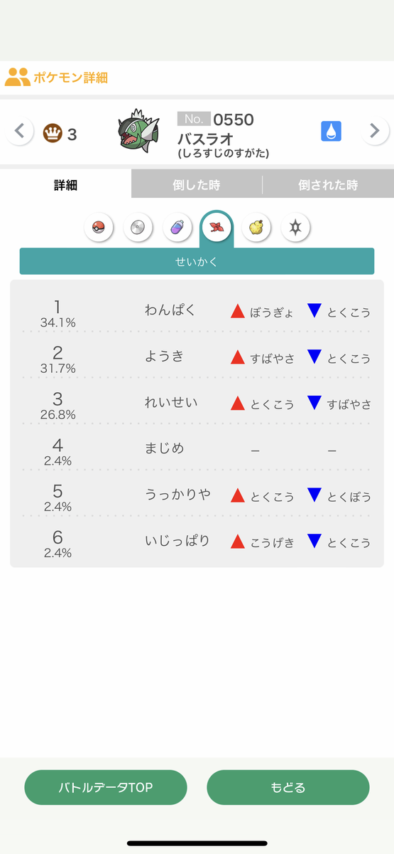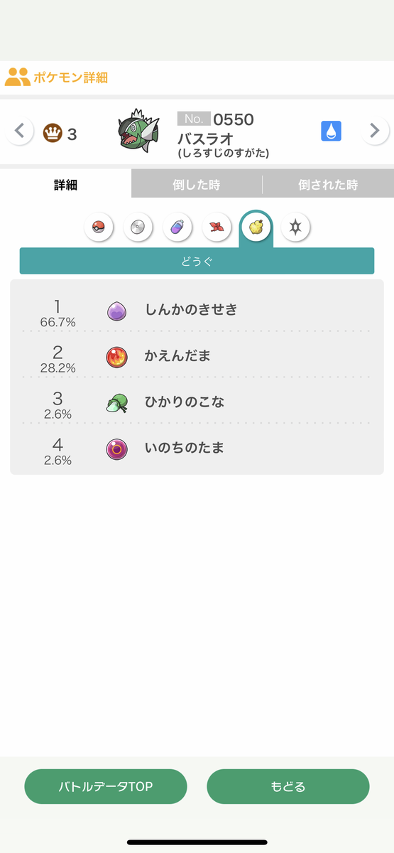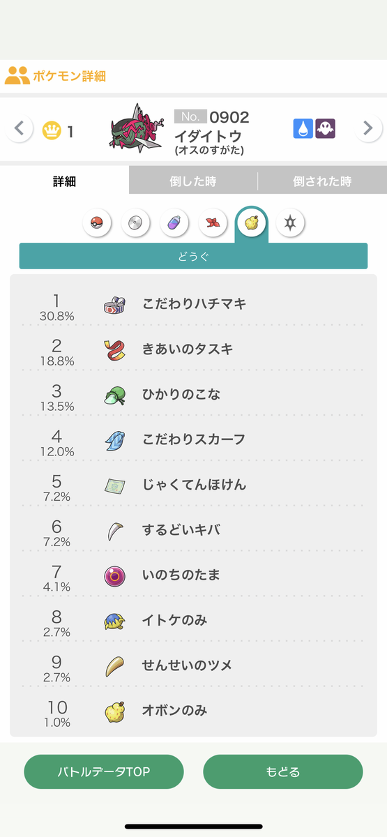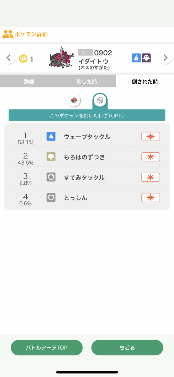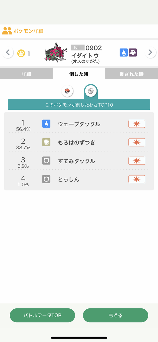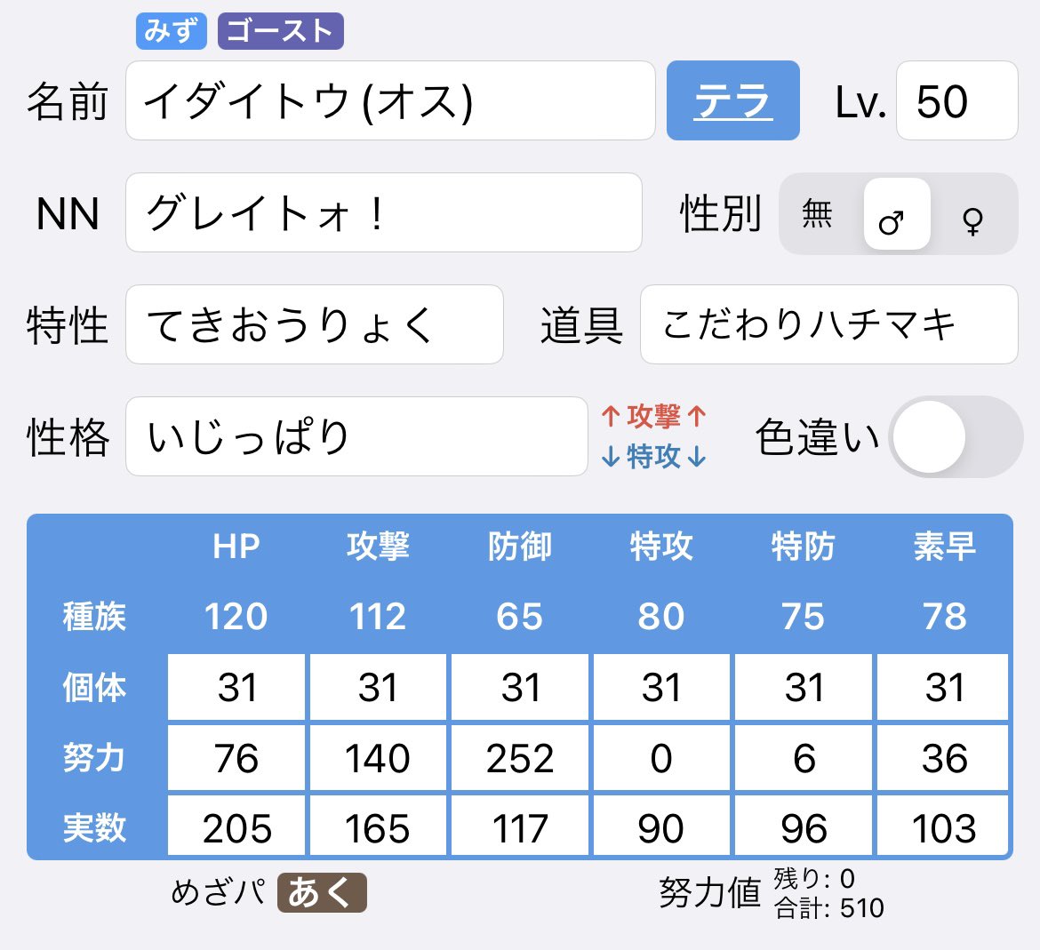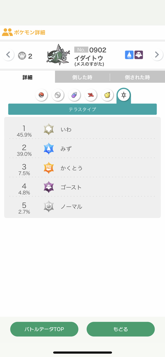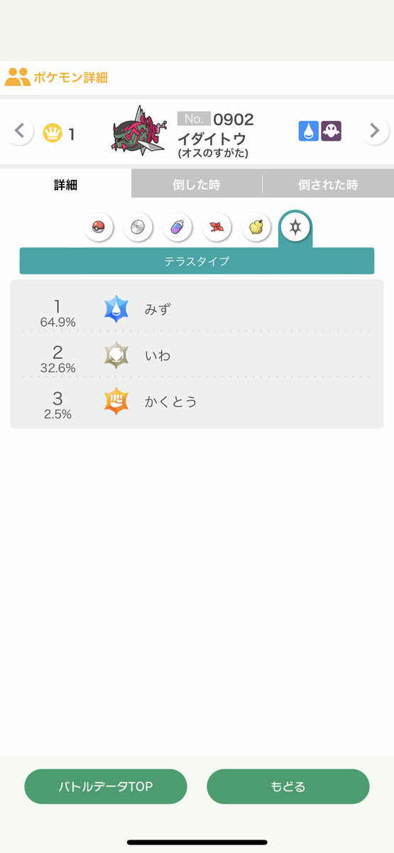 素早さは36振り。 AS振りに対しては勝てる想定、岩テラス型はウェーブタックルが抜群で入るためスカーフが多いと予想。一番人気のテラスは水と予想。ノーマルテラス型はテラスしないときに無効になるためリスクが高く少ないと予想。 対戦は3ターン以内に終わりそうで、2ターンで決着が一番多そう。