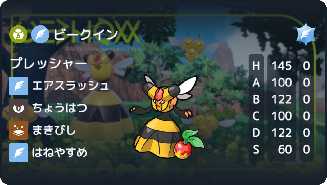 ちゃっぴーさん(@usagi_chappy)のビークインを紹介します(掲載の許可を頂きました)。このビークインにはもう、めっちゃびっくりしました。この時のちゃっぴーさんのパーティは、なんと虫統一でした。ハッサムのはたきおとすととんぼがえりで荒らされまくり、ビークインがちょうはつ、まきびし、エアスラでこちらのポケモンにやりたい放題してきました。おんみつマントドオーのどくづきでワンチャン狙おうとしたのですが、はねやすめがあるので厳しかったです。プレッシャーも地味に嫌でした。本人に聞くとヘイラッシャのじわれが効かないのもポイントで、確かにな〜と思いました。ヒメリはゴツメが余ってなかったから持たせたそうです。ちゃっぴーさんはなんでこんな型思いつくの!?って型をめっちゃ考え出していてすごい人です。構築の組み方が面白いので見たことない人は記事を見に行ってみてください。厳しい戦いで負けてしまいましたが、アツいサイクル戦で楽しかったです!